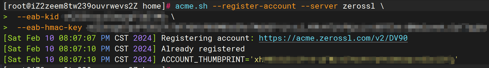 acme.sh --register-account --server zerossl \ --eab-kid xxxxxxxxxxxx \ --eab-hmac-key xxxxxxxxx