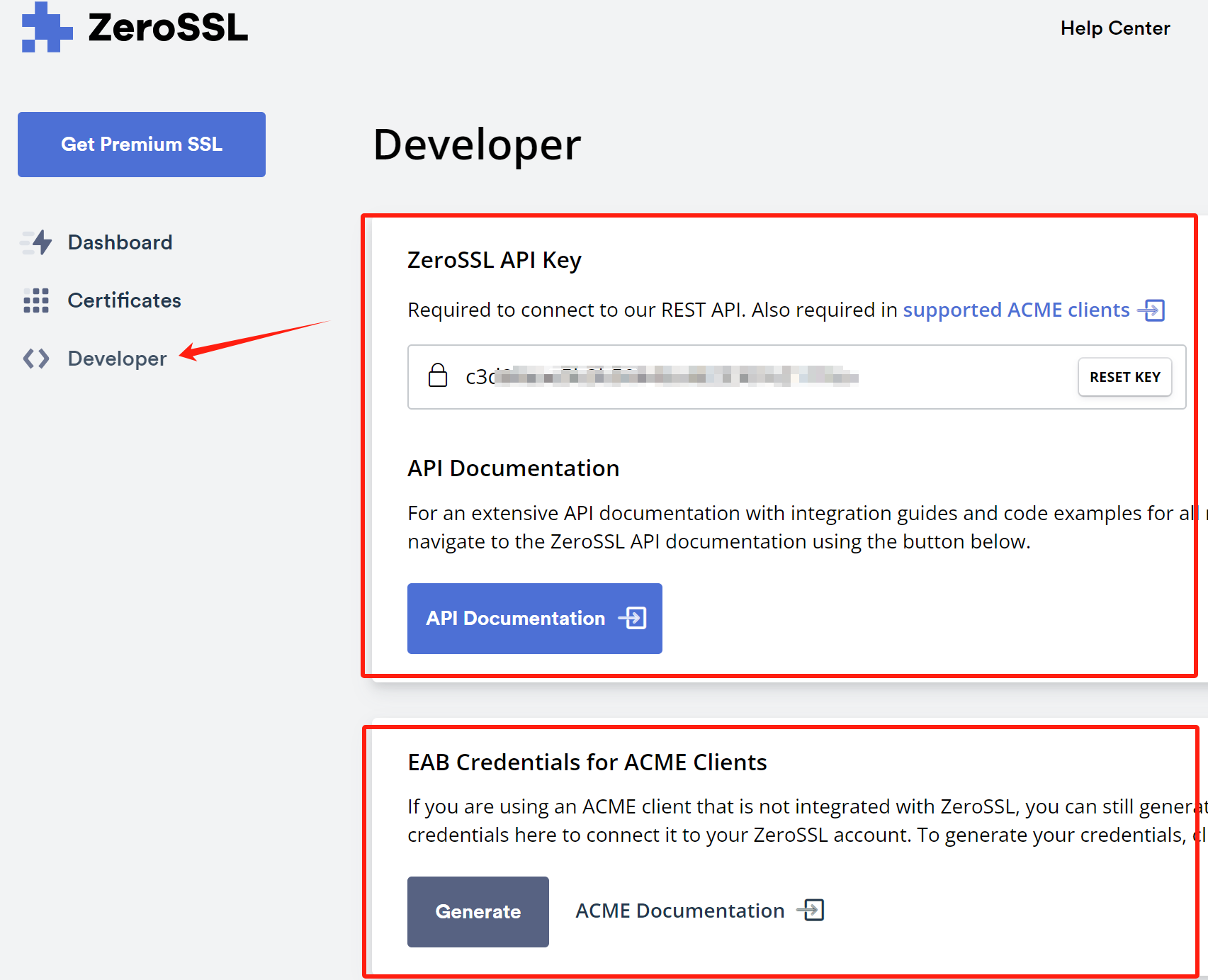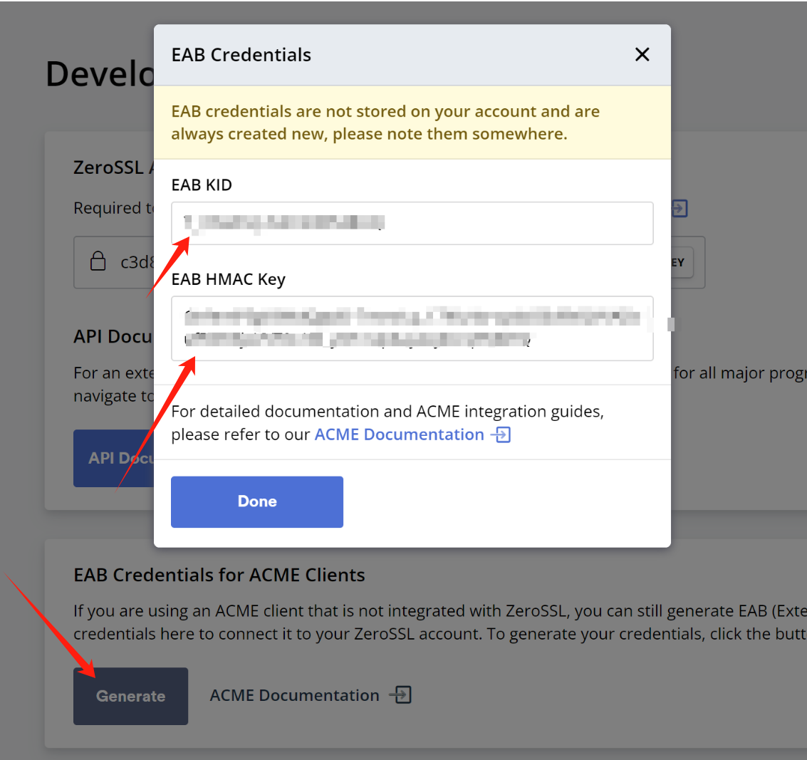curl -s -X POST "https://api.zerossl.com/acme/eab-credentials?access_key=c3xxxxxx" { "success": true, "eab_kid": "EWxxxxxxxx", "eab_hmac_key": "KPeQJxxxxxxxxx" }